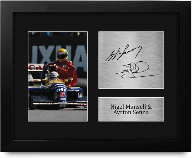 قاب کلکسیونی نایجل منسن و ایرتون سنا شامل یک تصویر حرفهای مشترک، پلاک فلزی با امضا و پلاک فلزی با نام هر دو راننده است. ترکیب طراحی کلاسیک، فریم مشکی و هویت مسابقهای این رانندهها، قاب را به انتخابی خاص برای کلکسیونرها، علاقهمندان موتوراسپرت و دکوراسیون رسمی اتاق یا دفتر کار تبدیل میکند.